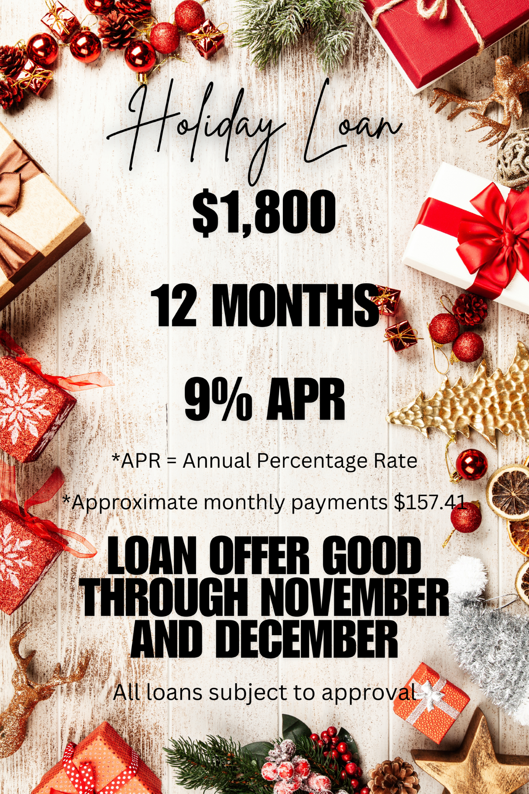 Need a small, fixed-term loan for holiday expenses? RLSCCU offers a $1,800 Holiday Loan at 9% APR for 12 months with an estimated payment of $157.41. Apply easily in minutes by calling (816) 356-0791. Offer runs November–December. All loans subject to approval.